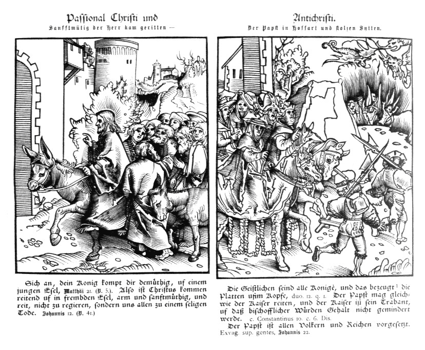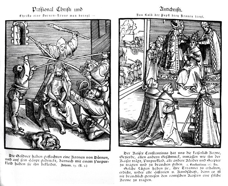 Lo que nos lleva a la obra en la que hoy nos detenemos es que Cranach fue íntimo amigo de Martín Lutero, para quien ilustró un influyente libro denominado Passional Christi und Antichristi publicado en 1521 y que implicó su excomunión. Se trata quizá del ejemplo más claro de propaganda reformista contra la Iglesia de Roma a través de las imágenes. Publicado en Wittemberg en marzo de 1521, el Passional Christi und Antichristi consiste en 13 xilografías, diseñadas por Lucas Cranach el viejo, con citas de la Biblia, decretos papales y sentencias, explicando las teorías elaboradas por Melanchthon y el jurista Johann Schwerdtfeger. Traduce en imágenes la idea primeramente formulada por Lutero para refutar el ataque de Ambrosius Catharinus a sus trabajos. Viene a significar que el Papa encabeza la Iglesia del Anticristo. Cranach asalta a Roma desfigurando y envileciendo su imagen. Basado en una profecía en el libro de Daniel, y continuado por una leyenda popular durante la Edad Media. Más que introducir al papa en los episodios de esta fábula, el libro muestra al Papa tal y como se representa a si mismo, en ceremonia, procesión y fiestas, escenas que contrapone con los episodios de la vida de Cristo.